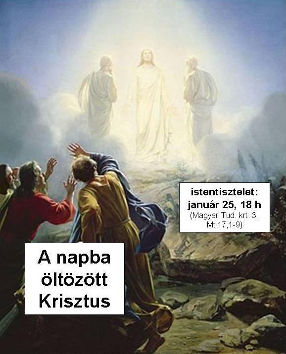 Miért leírhatatlan az, hogy mivé változott át Jézus, amikor Isten megmutatta a dicsőségét a három apostolnak? Honnan tudjuk azt, hogy mit éreztek az apostolok, amikor meglátták Jézus dicsőségét? Miért pont ekkor történt ez? Honnan tudták az apostolok, hogy a két levegőben álldogáló kisöreg Mózes és Illés? Bemutatkoztak nekik? Hány hülyeséget mondott Péter azzal a két ártatlan mondatával, amit ki tudott mondani a hasra esése előtt? Miért takarította el Isten Mózest és Illést röviddel ezután? Mi a Mennyei Atya szózatának a legfontosabb két szava? Mi következik ebből a történetből a mi életünkben itt és ma? Erről szól az istentiszteletünk igeszakasza (Mt 17,1-8) és az igehirdetés. Az igehirdetést itt lehet meghallgatni és a szövegét innen lehet letölteni. A következő, a böjt előtti időt elkezdő, Hetvened vasárnapi istentiszteletünk február 1.-én lesz. Szeretettel várunk minden felsőoktatásban tanulót, vagy oktatót vagy oda készülő középiskolást a MEÖT székházban!