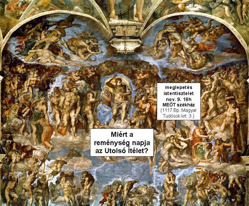 Mi a csudának kell nekünk ma az Utolsó Ítélet napjával foglalkoznunk? Hát nincs e nélkül elég bajunk? Miért nem érdemes azzal foglalkozni, hogy milyen szimbólumok vannak az Utolsó Ítélet leírásában? Ki fogom-e bírni az Utolsó Ítélet napját? Mi lesz az Utolsó Ítélet napjának az egyetlen igazi jele? Mikor és hogyan nem lesz az Utolsó Ítélet napja borzalmas? Miért a reménység napja az Utolsó Ítélet? Kiknek a reménység napja az Utolsó Ítélet? Hogy ebből a Mt 24,15-31 igeszakasz által felvetett sok-sok kérdésből (és másokból...) MIRŐL szól a november 9.-én, vasárnap este 6-tól tartott istentiszteletünk igehirdetése, az MEGLEPETÉS. A Szántó Csongor által tartott igehirdetés szövegét innen lehet letölteni és itt lehet meghallgatni. Aki el szeretné olvasni a minden egyes őszi napon is elkészülő 10-12 soros igehirdetésemet (és még nem tagja a bibliaolvasó Facebook csoportnak :) jelentkezzen itt. A következő meglepetés istentiszteletünk november 16.-án lesz. Szeretettel várunk minden felsőoktatásban tanulót, vagy oktatót vagy oda készülő középiskolást a MEÖT székházban!