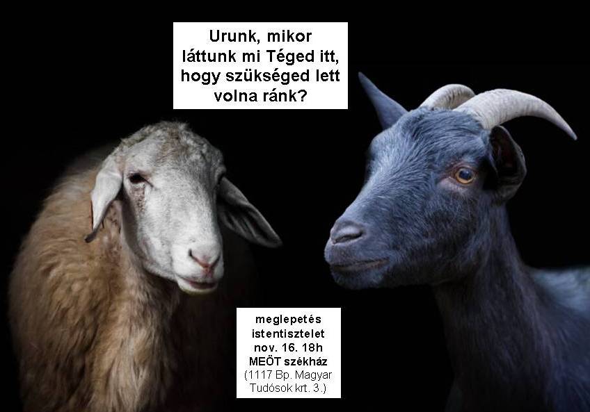 Miért pont a kecskék kárhoznak el? És miért a juhok üdvözülnek? Miért nem sok az irgalmasság hat cselekedete, amelyet Jézus kér tőlünk? Miért pontosan az a vád lényege, amit mi mentségnek gondolunk: hogy "Mikor láttunk mi Téged itt, hogy szükséged lett volna ránk?" Milyen a jézusi szeretet? Hogyan igaz az egyszerre, hogy már egy jó cselekedet is elég az üdvözüléshez, de egyetlen egy elmulasztott jó cselekedet elég a kárhozathoz? Miben áll ezek után a mi reménységünk? Erről szól a Mt 25,31-46 igeszakasz alapján megtartott igehirdetés. Az igehirdetést itt lehet meghallgatni, a szövegét innen lehet letölteni. Aki el szeretné olvasni a minden egyes őszi napon is elkészülő 10-12 soros igehirdetésemet (és még nem tagja a bibliaolvasó Facebook csoportnak :) jelentkezzen itt. A következő meglepetés istentiszteletünk november 23.-án lesz. Szeretettel várunk minden felsőoktatásban tanulót, vagy oktatót vagy oda készülő középiskolást a MEÖT székházban!