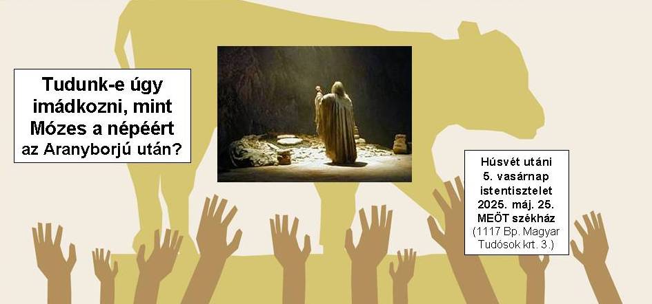 Mi mindenért volt bűn az aranyborjú? Miért fontos az, hogy nem aranybika -- csak borjú? Tényleg engedélyt kér Isten Mózestől, hogy végrehajtsa engedetlen népén a jogos büntetést? Mi Mózes válasza Istennek arra a példátlan ajánlatára, hogy az ő családjából lesz a választott nép egésze? Miért lehet ez az igeszakasz az imádság vasárnapjának az igeszakasza? Mi Mózes imájának az érvrendszere? Mi ebben az egyetlen lényeges elem? Miért indul szánalomra Isten? Mi mindebből a tanulság nekünk, ma? Mi a sokkal nagyobb baj annál, ha vétkeztünk? Mi az imádság lényege? Mi történik velünk, ha eljutunk egy olyan imához, mint amilyen Mózesé volt? Erről fog szólni a május 25.-én, Rogate, az imádság vasárnapján este 6-tól tartott istentiszteletünk igeszakasza (2Móz 32,7-14) és az igehirdetés. Az igehirdetést itt lehet meghallgatni, a szövegét innen lehet elolvasásra letölteni. A következő istentisztelet május 29.-én, CSÜTÖRTÖKÖN, Mennybemenetel ünnepén, azt azt követő pedig június 1-én, a húsvét ünnepe utáni 6. (Exaudi) vasárnapján este 6-tól lesz. Szeretettel várunk minden felsőoktatásban tanulót, vagy oktatót vagy oda készülő középiskolást a MEÖT székházban!