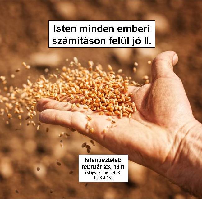 A bőjtelő időszakának három igehirdetése (a szőlőmunkások és a magvető példázata, valamint a jerikói vak története) mind-mind arról szól, hogy Isten minden emberi számításunkon felül jó. Mi a mag és mi a talaj? Mi a fontosabb: a mag, vagy a talaj? Miért nem talajválogató a magvető? Miért ugyanaz a mag mindenkinek? Miért nem elég az ész Isten igéjének a befogadásához? Miért nem értették az apostolok a példázatot? Miért és hogyan lesz a mi életünk dísznövény helyett – bőséges termés? Erről fog szólt a február 23-án este 6-tól tartott istentiszteletünk igeszakasza (Lk 8,4-15) az igehirdetés. Az igehirdetést itt lehet meghallgatni, a szövegét innen lehet elolvasásra letölteni. A következő istentisztelet március 2-án, vasárnap este 6-tól lesz. Szeretettel várunk minden felsőoktatásban tanulót, vagy oktatót vagy oda készülő középiskolást a MEÖT székházban!